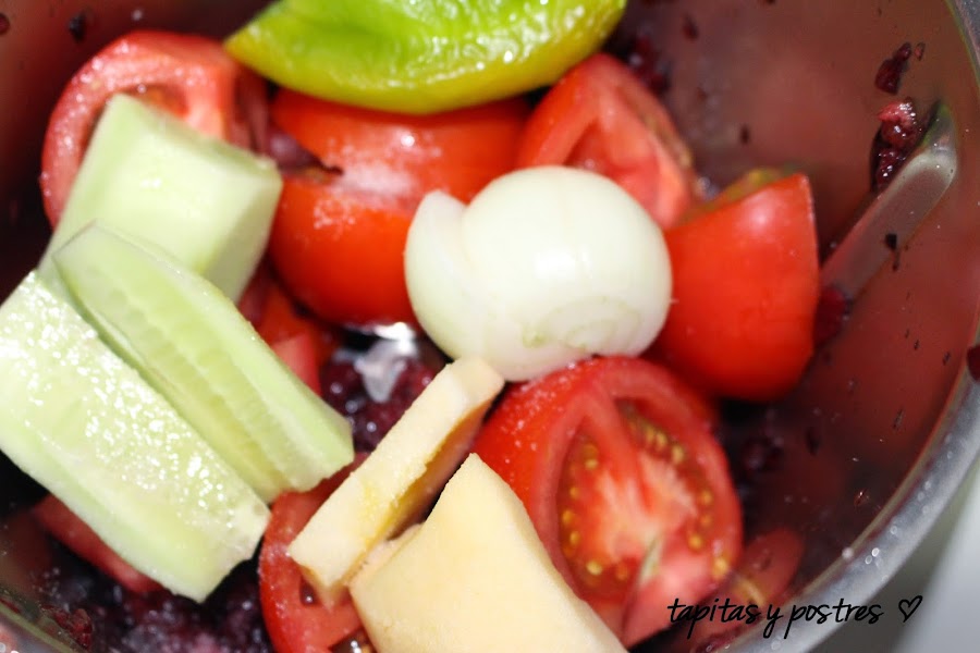 Añadimos el resto de los ingredientes: tomates, cebolla, pepino, ajo, pimiento, manzana, sal y vinagre. Trituramos todo muy bien. Si queréis poner aceite (yo no he puesto) lo añadís al final y volvéis a batir.