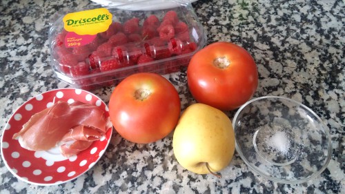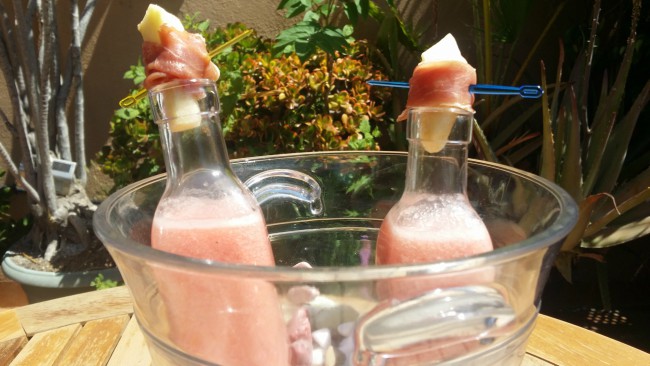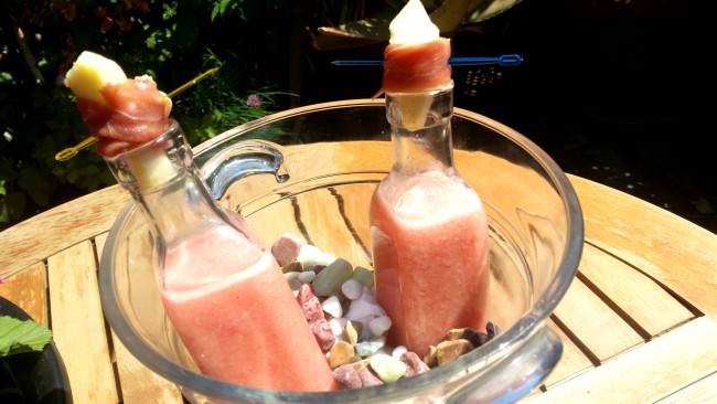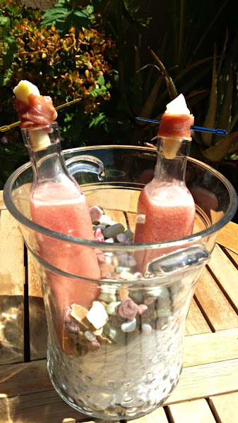 - Echamos en botellas de cristal pequeñas la mezcla de frambuesa y tomate y cerramos con el tapón.