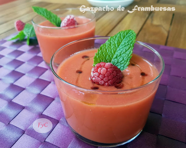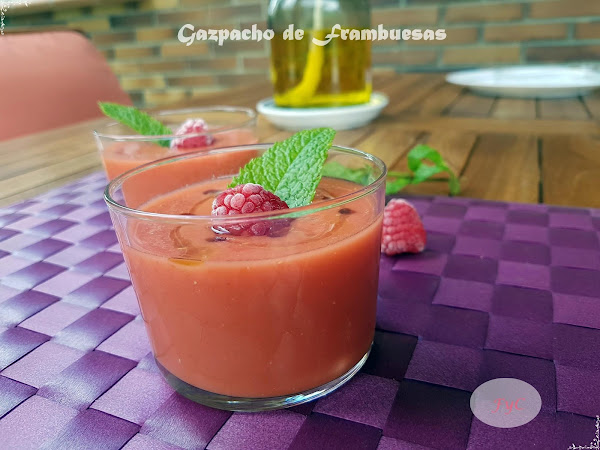 500 gr. de tomate de pera maduro, 200 gr. de frambuesas, 40 gr. de cebolleta, 30 gr. de pimiento morrón rojo, 50 gr. de pepino, 1 diente de ajo no muy grande sin germen, 30 gr. de pan asentado (yo cuando no lo tengo pongo miga de molde o pan rallado...), 1/2 cucharada sopera de sal, 50 gr. de AOVE, 10 gr. de vinagre de jerez.
