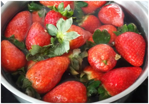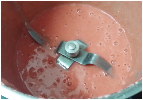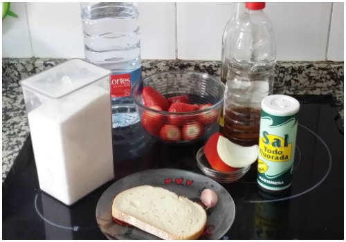 1- Poner las fresas, la cebolla, el pan empapado con el vinagre, sal, el pimiento, el ajo, el pepino y el azúcar en una trituradora o en el vaso de la batidora eléctrica y triturar hasta que se haga una papilla.