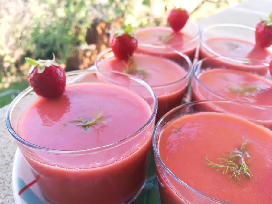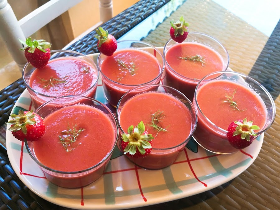 - Salpimentamos, añadimos agua hasta obtener la textura que queramos (en mi caso 400g.) y servimos decorando con las hojas de hinojo y alguna fresa