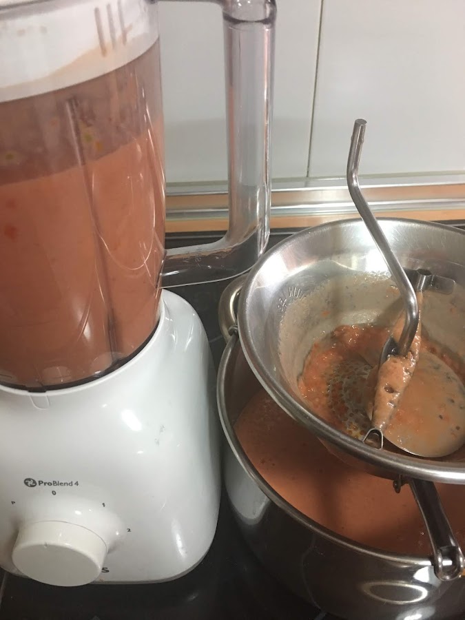 Con esta cantidad os dará para llenar dos veces el vaso. Después, se pasa por el chino o pasapuré para eliminar las pepitas del tomate y que quede más fino.