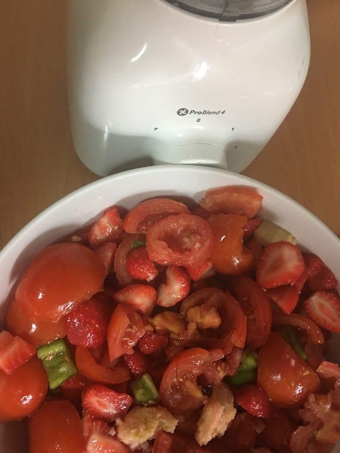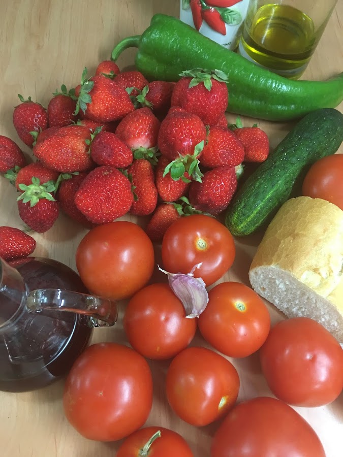 Se añaden todas las verduras toceadas y las fresas a una ensaladera grande. Se incorpora el pan en trozos, el diente de ajo muy picado, la sal, el aceite y el vinagre. Se puede añadir un poco de agua fría para que no resulte muy espeso.