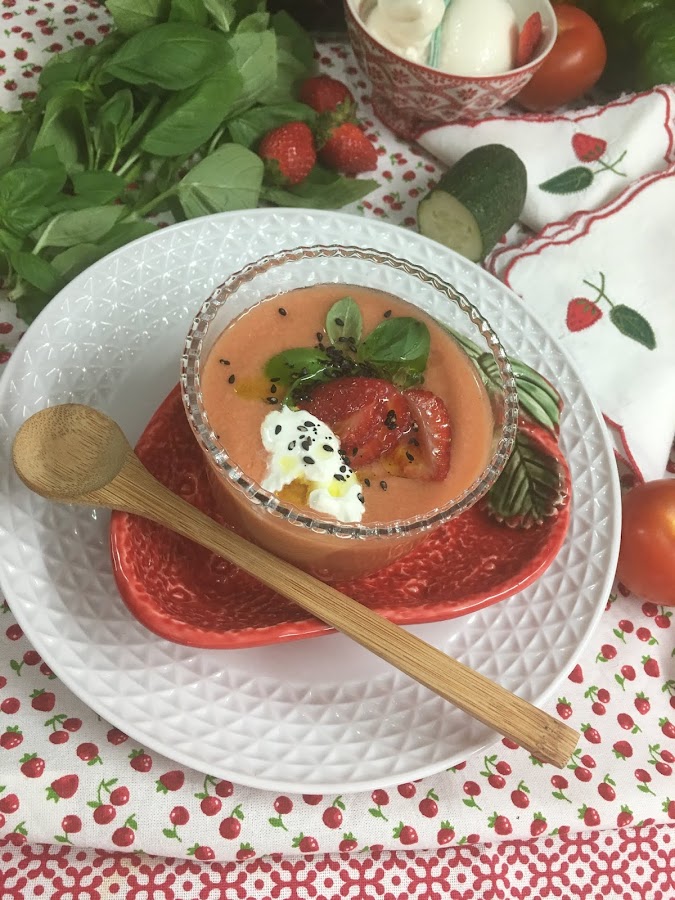 Aunque ahora no es temporada de fresas, aquí en España, gracias a nuestra latitud y a los invernaderos de Almería y la huerta murciana, siempre tenemos una enorme variedad de frutas durante todo el año. Por eso, no es difícil encontrar fresas fuera de temporada y preparar este gazpacho.