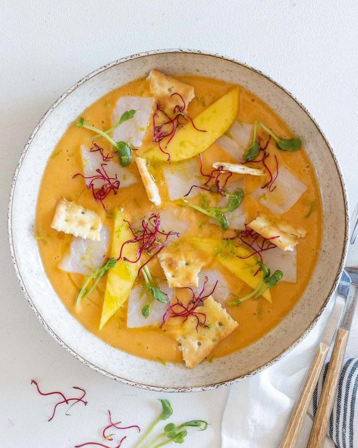 Este gazpacho con toque tropical es de lo más refrescante y rico que probarás este verano. El acompañamiento que lleva este plato es también muy importante ya que completa la paleta de sabores. El bacalao aporta su sabor ahumado y ligeramente salado, mientras que los germinados de guisante y remolacha ponen el toque aromático, colorido y fresco al plato. La otra razón por la que me gusta añadir germinados es porque su textura crujiente contrasta de maravilla con la cremosidad del gazpacho. Ya veréis que rico es probarlo todo junto de un bocado.