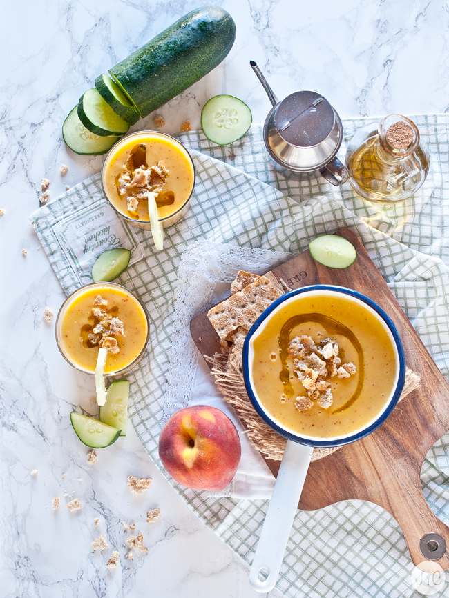 - Colocamos los melocotones en trozos y el pepino en trozos en la batidora y batimos a velocidad máxima hasta que se forme una crema homogénea.
