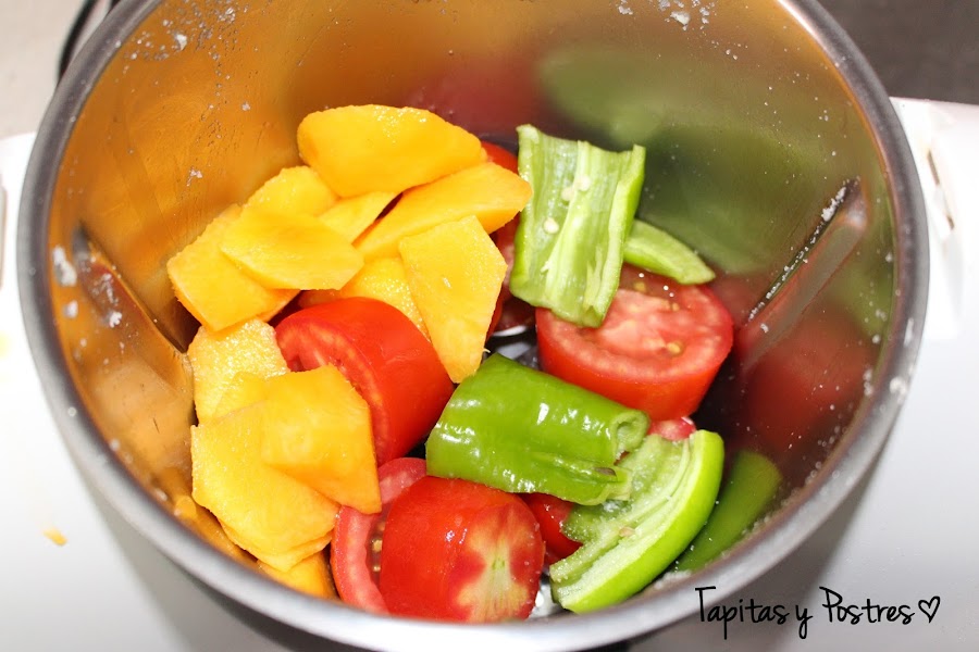 Ponemos el diente de ajo con un pellizco de sal en el vaso de la batidora o de la thermomix y trituramos 5 segundos a velocidad 7. Bajamos los restos de las paredes hacia abajo y agregamos los tomates bien lavados, troceados a cuartos, el pimiento igual, el melocotón sin piel y trituramos 30 segundos a velocidad progresiva 7-10.