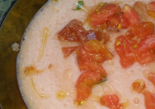 Pilar del blog "Postres originales" nos propone una fruta y un cereal… este mes ha tocado el melón como fruta ¡Perfecto! y como cereal la avena ¡Perfecto, también! Entonces ¿qué hago? El melón me encanta pero la avena es un cereal que acabo de descubrir… entonces? Al final he pensado en este melón con jamón por varias razones… he probado varios gazpachos con frutas, por ejemplo el gazpacho de fresas… ¡Buenísimo! Y he probado algunos más… a cada cual, mejor. Por eso, me decidí a probar este gazpacho de melón con jamón . El chef del que he cogido la receta es Bruno Oteiza. Durante algún tiempo seguí a este chef en la televisión. Me encanta su sencillez y su saber comunicar. Hace recetas muy sencillas con ingredientes cotidiano… como a mí me gusta.