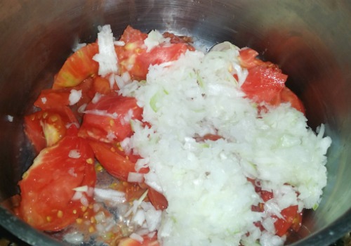 Pela y trocea 2 tomates y medio y ponlos en un bol. Añade la cebolleta troceada.