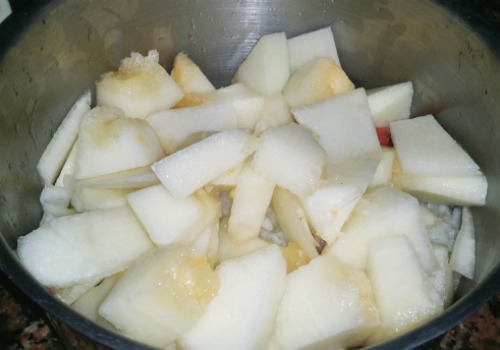 Pela y retira las pepitas del melón. Trocea el melón y lo introduces en el bol.