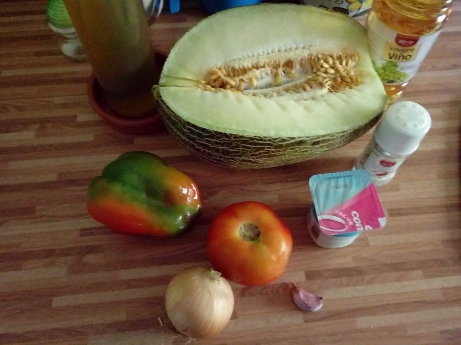 Un gazpacho diferente y refrescante que nos puede servir para aprovechar un melón que esté madurando y no queremos que se eche a perder. Con estas cantidades salen unos 6 platos y podemos tenerlo en la nevera un par de días. Ideal para refrescarnos en estos calurosos meses.