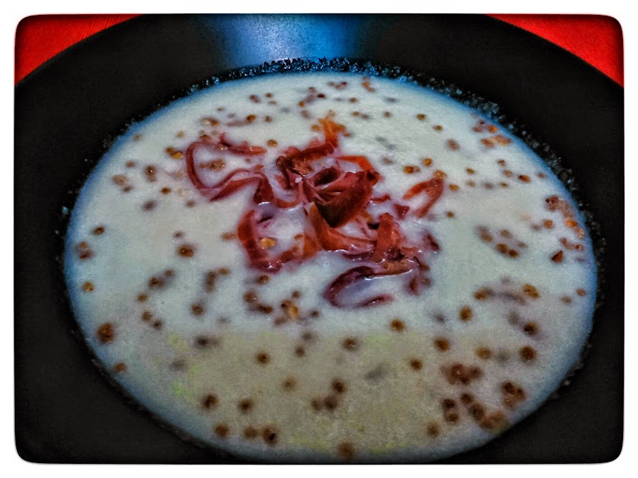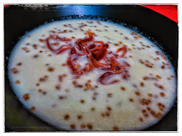 Lo metemos en una jarrita y dejamos enfriar al menos durante 4 horas, es fundamental beberlo muy fresquito, se puede servir en un vasito o como yo he hecho en un plato acompañado de jamón serrano y un poco de crujiente de almendra tostada, le da un toque muy bueno.