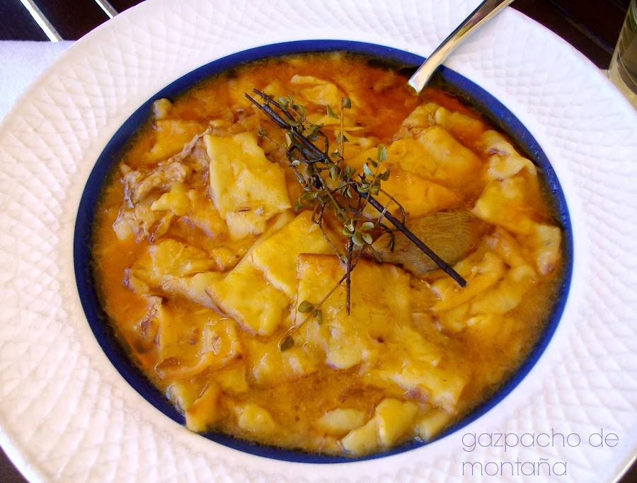 El gazpacho de montaña,también conocido como gazpacho manchego,es un plato cuyo ingrediente principal es la torta cenceña,una especie de pan ácimo sin levadura.,,que al cocerlo después con el caldo de las carnes,queda una pasta muy rica,con mucho sabor .