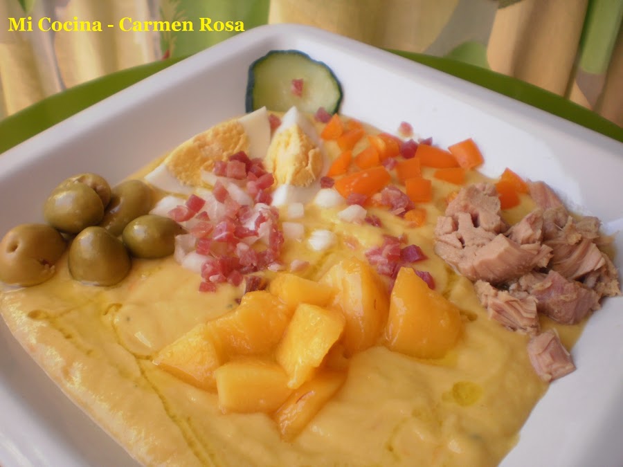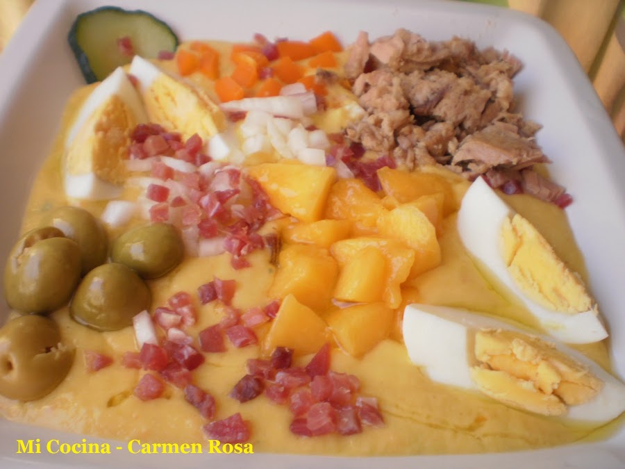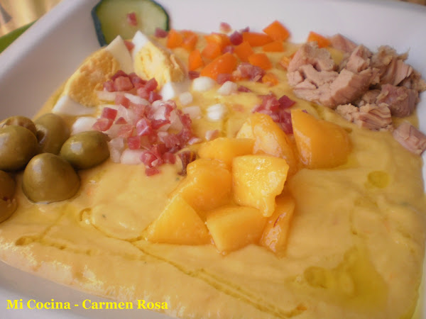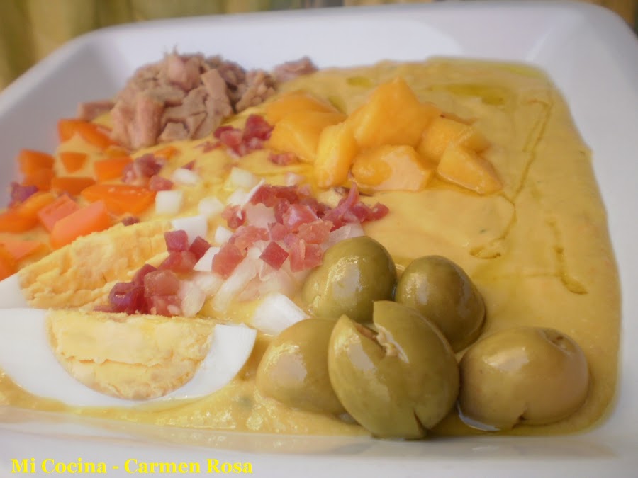 Frutas, verduras, un plato completo, lleno de salud….para combatir las calores, que a la hora de añadir ingredientes para guarnición me dicen en Mi Cocina: ¡¡ Eres muy exagerada !! Pués sí, como buena malagueña…..soy "mú exagerá".