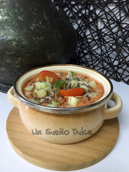 La guarnición puede ser a vuestro gusto. Con estas cantidades queda un sabor equilibrado de dulce y me gustó el contraste con el pepino y las almendras. Pero podéis poner tanto la guarnición más clásica, como una más creativa, lo dejo a vuestra elección. Al igual que las cantidades de tomate y nectarina.