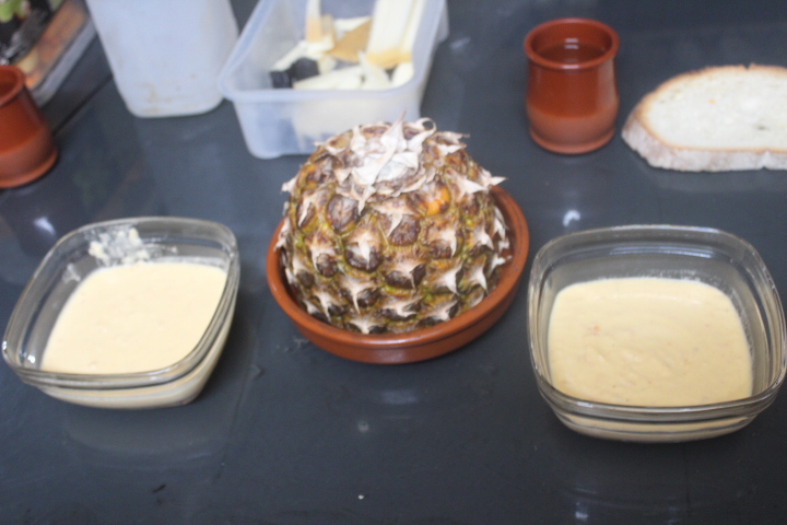 Lavamos y troceamos el pepino, lo introducimos en el vaso de la batidora, le añadimos un ajo, la piña troceada, aceite, sal y vinagre al gusto, trituramos todos los ingredientes.