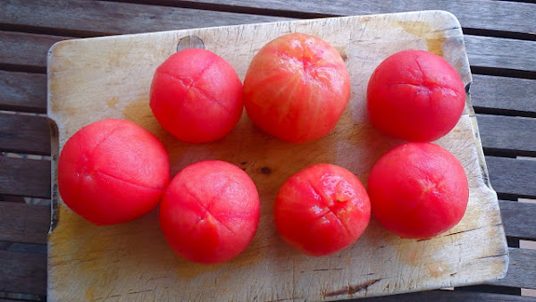 Hacemos unos cortes en forma de cruz en los tomates, los escaldamos en agua hirviendo y los pelamos. Cortamos en cuartos los tomates pelados y retiramos las semillas, reservando sólo la carne.