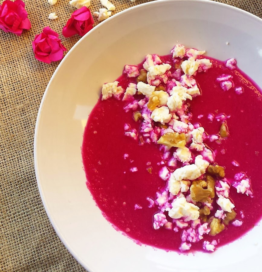Me encanta este gazpacho de remolacha porque tiene un color tan bonito que no deja a nadie indiferente, queda genial combinado con el queso feta y las nueces. Delicioso, fresco, sano y con una estética preciosa, así que ¿Qué más se puede pedir? Es un plato fabuloso.