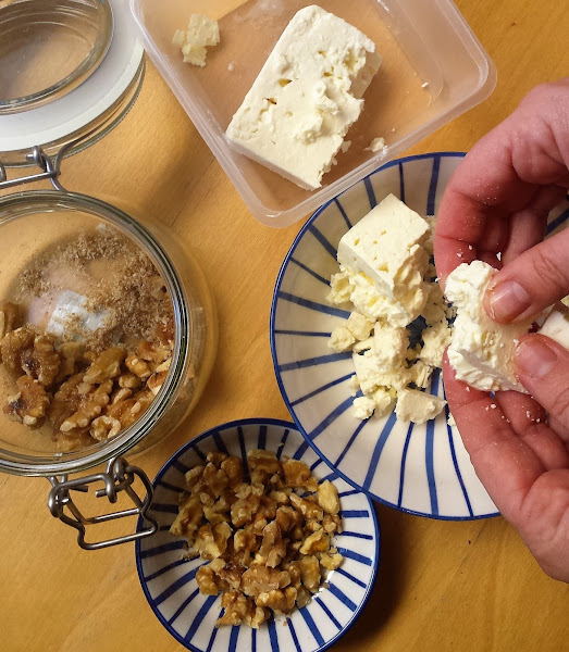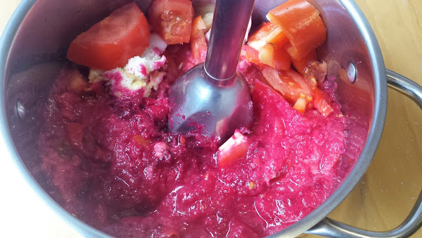 Gazpacho de remolacha con queso feta, comino y nueces, preparación: