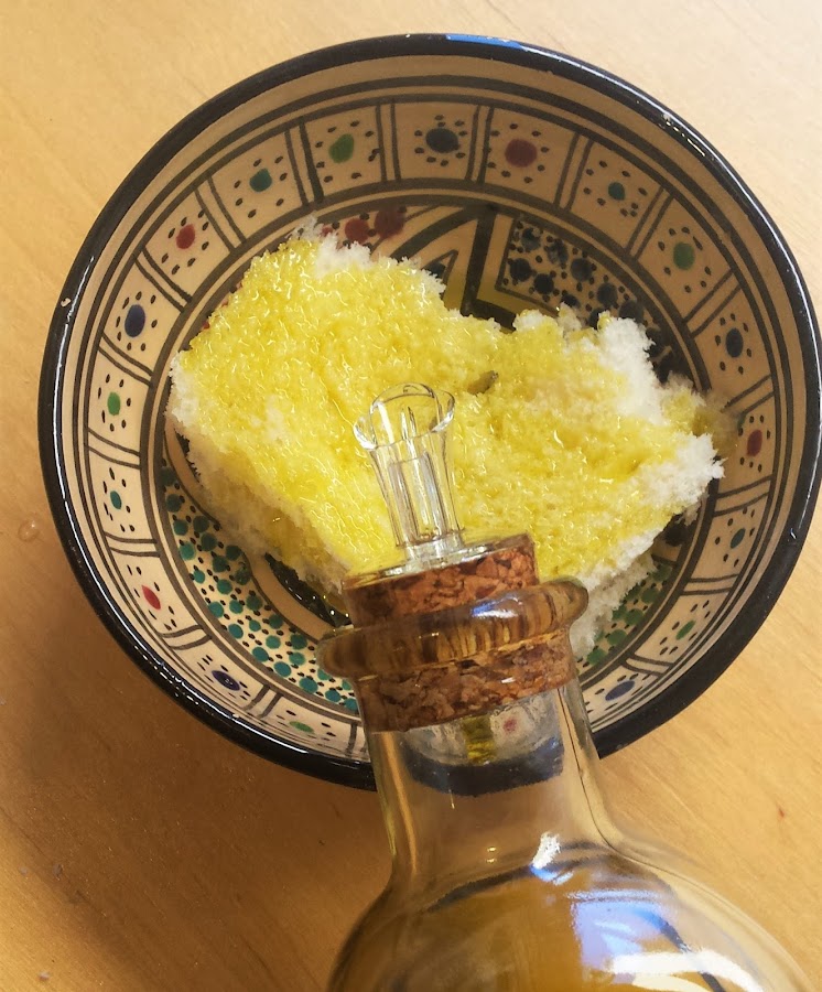 Ponemos el pan duro en remojo en el vinagre y el aceite. Mejor usar sólo la miga del pan y no la corteza.