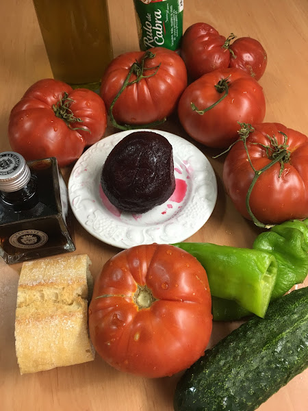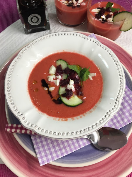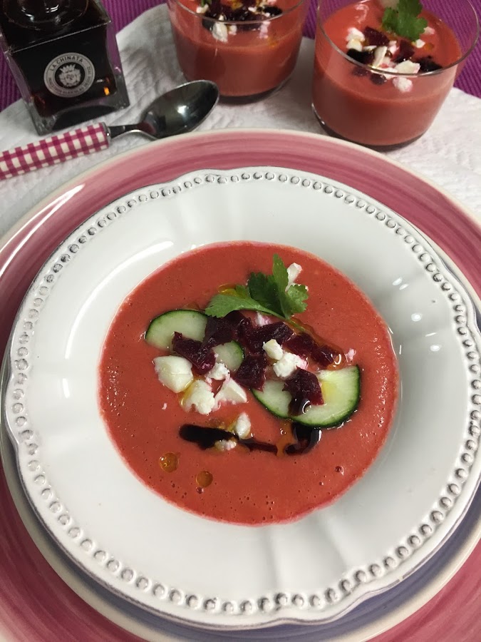 Este gazpacho se elabora como uno tradicional, lo único es que al batir las hortalizas se le añade un trozo de remolacha. El color es más intenso, más rosado y los tropezones de queso de cabra le dan un toque más modernete.