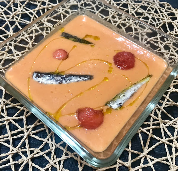 Yo he sido fiel a los ingredientes pero lo he hecho en la thermomix así que todo bien lavado y cortado en trozos y al vaso 30seg/vel5 y luego 3min/vel10, yo no lo he colado pero en la receta original va colado, esto ya a tu gusto, y reserva en la nevera hasta el momento de servir.