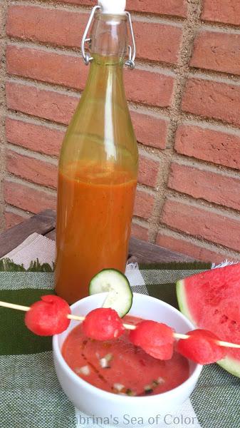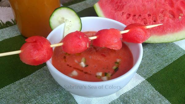 pimentón rojo, pepino, sandía y cebolla para decorarGazpacho de sandía, refrescante!. Vídeo