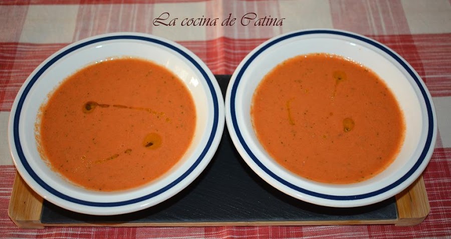 Colocamos los tomates, el ajo, el apio, la cebolla, la sandía, el pan y 10 gramos de albahaca en una batidora (yo lo he triturado en Thermomix), junto a una cucharadita y media de sal y un pellizco generoso de pimienta negra. Batimos hasta obtener una preparación homogénea, y con el aparato en marcha, añadimos el aceite de oliva y el vinagre.