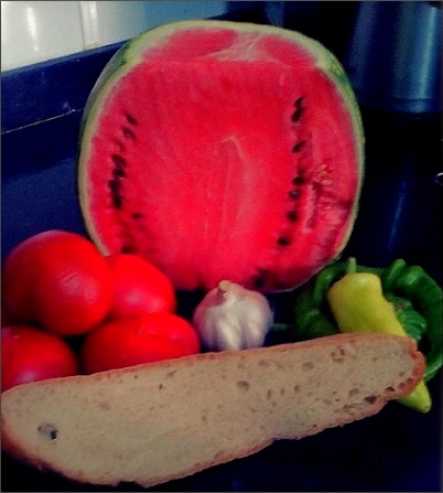 A continuación, cortamos los tomates y los pimientos en cuatro trozos, pelamos el diente de ajo y troceamos. Después le quitamos la corteza a la rebanada de pan y la empapamos bien en vinagre.