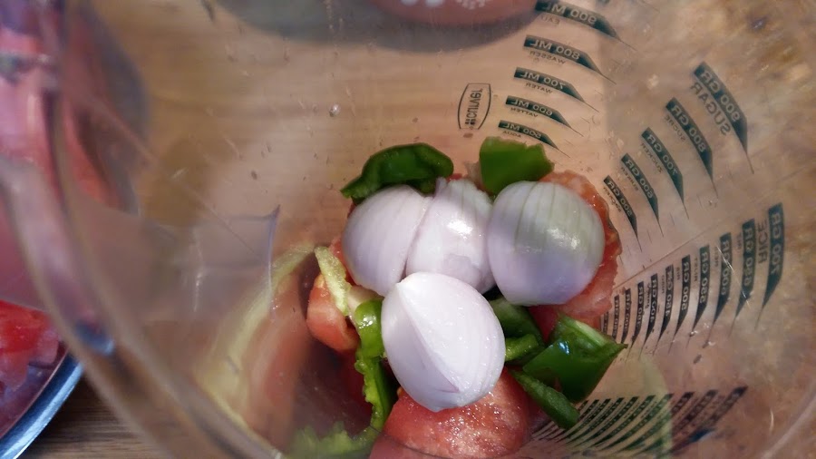 Triturar los tomates pelados, el pimiento y la cebolla.
