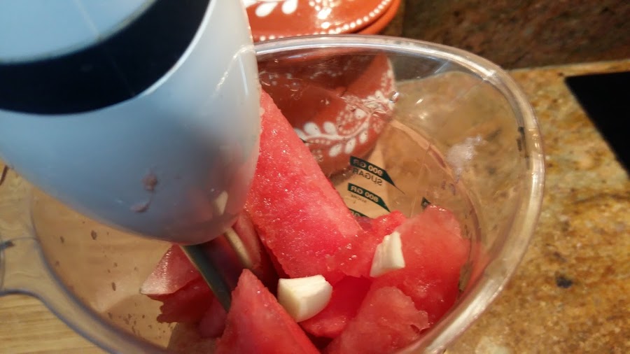 Añadir la sandía limpia de pepitas y el ajo, 2 cucharadas de aceite de oliva, sal y vinagre al gusto.