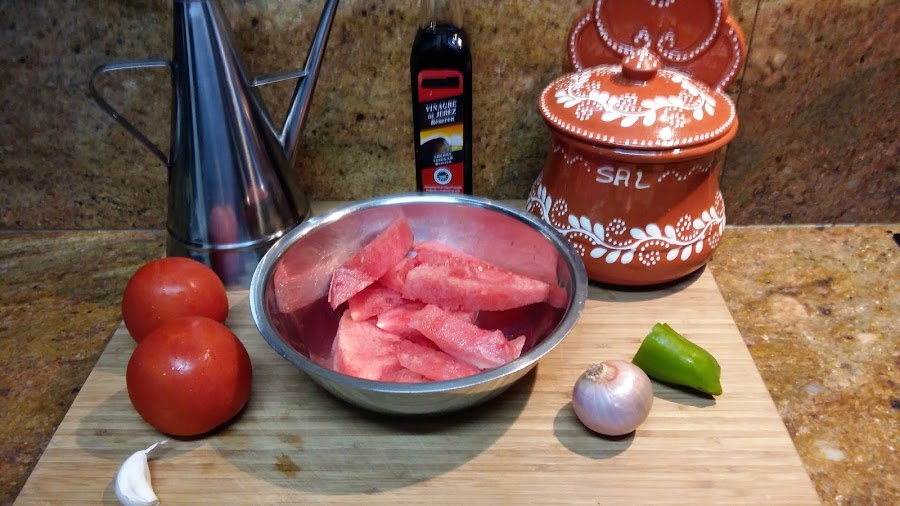5 tomates rojos y maduros, la misma cantidad de sandía (pelada y sin pepitas )que de tomate, 1/2 cebolla, 1 pimiento verde, 1/4 de diente de ajo, aceite de oliva, sal y vinagre de jerez
