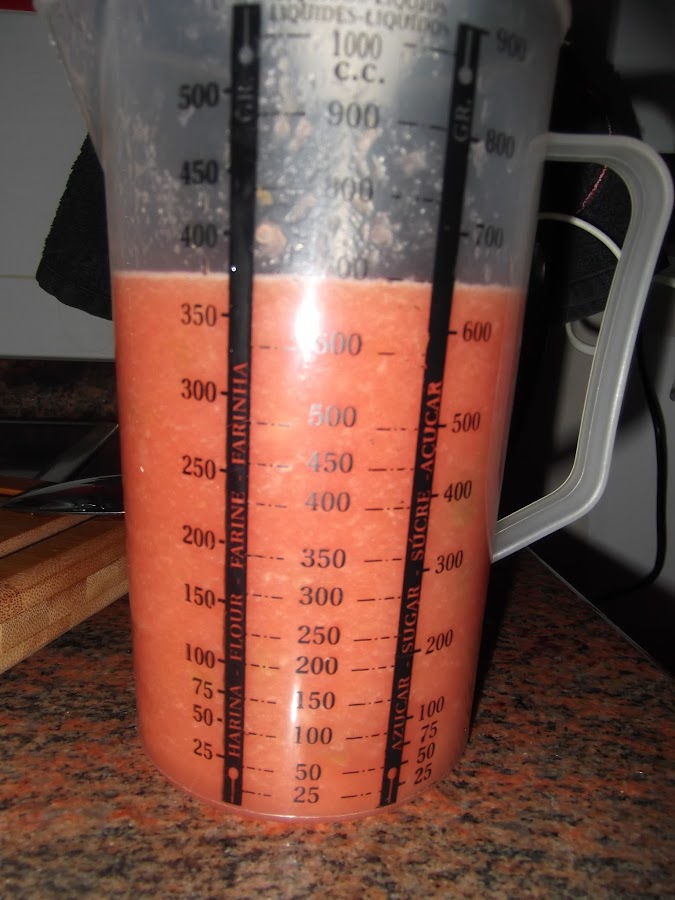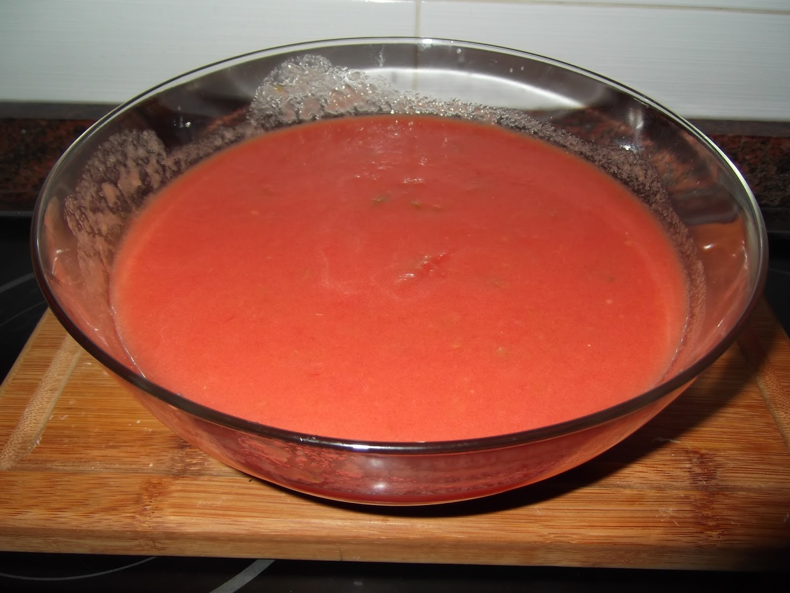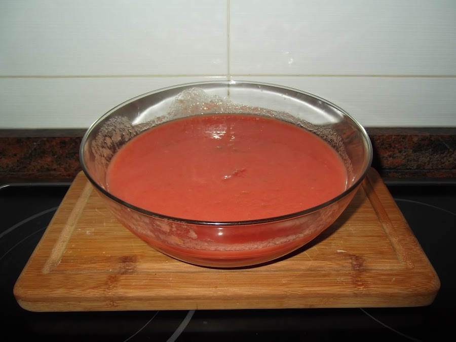 El siguiente paso es cortar el pimiento verde, la cebolla y el ajo, quitarle el germen que tiene y así repetirá menos. Lo colocáis todo en un vaso y lo batís. A continuación, añadís el aceite y el vinagre y la sal. Lo volvéis a batir y ya está listo para comer, si habéis dejado las pieles al tomate o el pimiento tenía una piel muy dura colarlo para que no os encontréis pieles a la hora de degustarlo. Si veis que os queda muy líquido y lo queréis un poco más espeso se soluciona añadiéndole un poco de pan del día anterior.