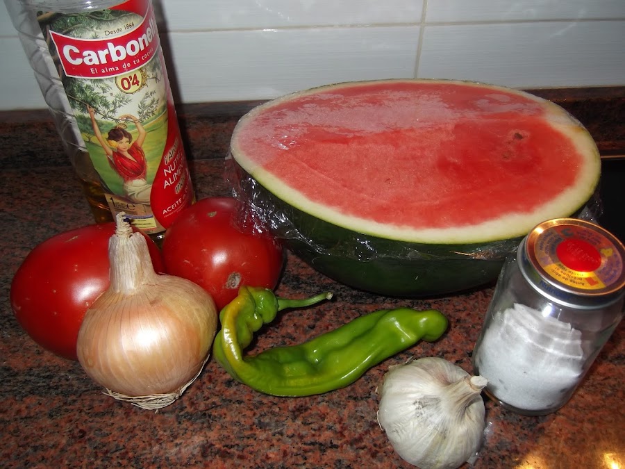 Lo primero que hacemos es limpiar la sandía de piel y pipas y la cortamos en trozos pequeños. Hacemos lo mismo con los tomates, para que os quede más fino es mejor que los peléis, por supuesto los tomates tienen que estar muy maduros y si son del huerto el plato os quedará mucho más sabroso.