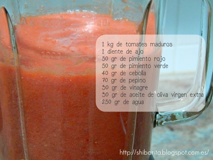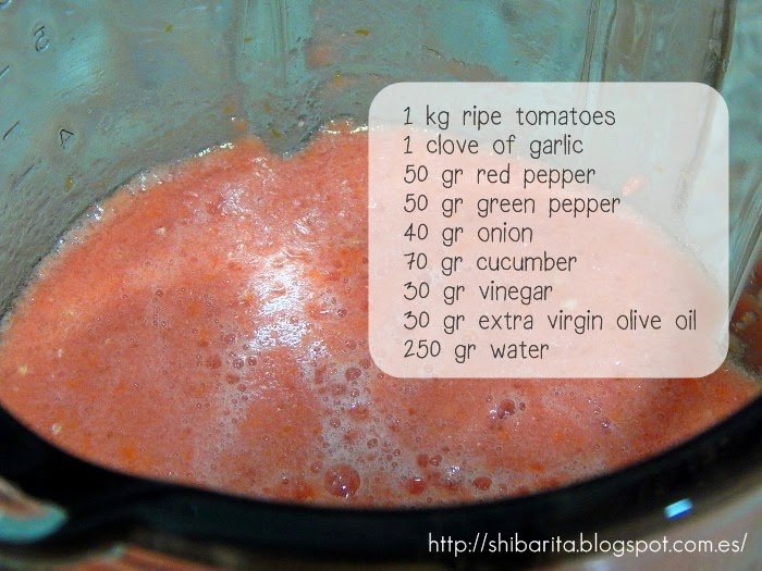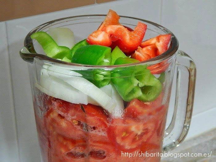 Poner todos los ingredientes en el vaso de la batidora excepto el agua y el aceite. Batir hasta que quede todo completamente triturado. Añadir el agua y volver a batir. Finalmente añadimos el aceite y batimos para que se integre bien con el resto de los ingredientes.