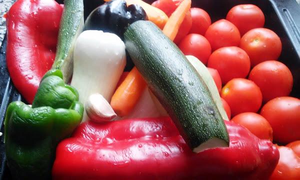 Lavamos todas las verduras, cortamos los calabacines, berenjena , pimientos y cebolla por la mitad y lo colocamos todo en la bandeja del horno. Lo único que no asaremos es el pepino que irá crudo.