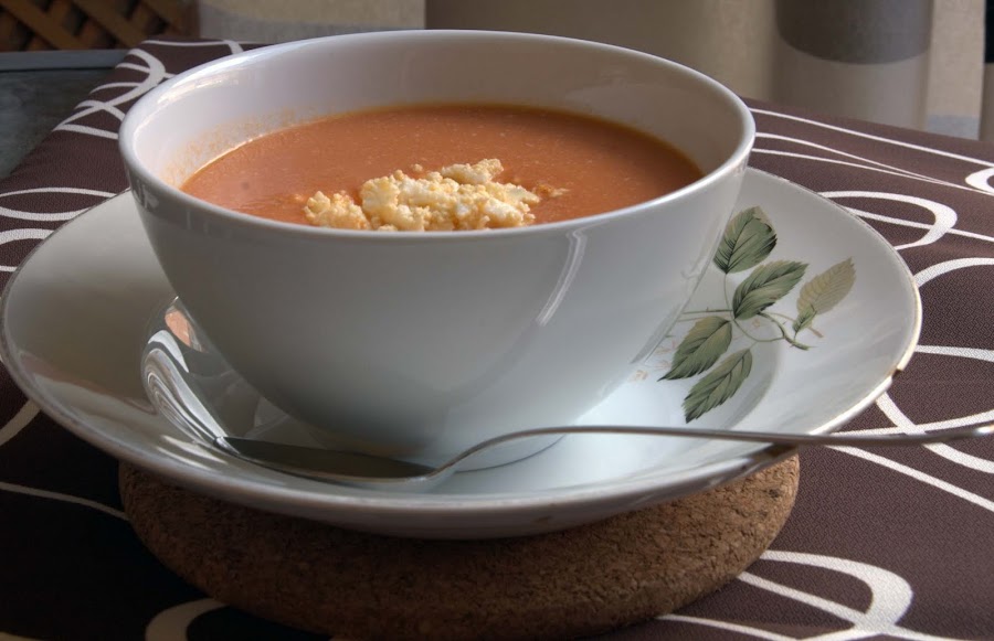 Es muy fácil, trituramos todos los ingredientes menos unos de los huevos cocidos, pasamos por un chino para quitar las pepitas y las pieles.