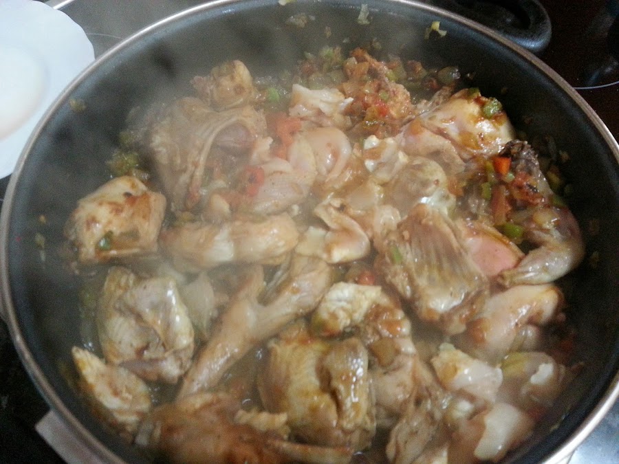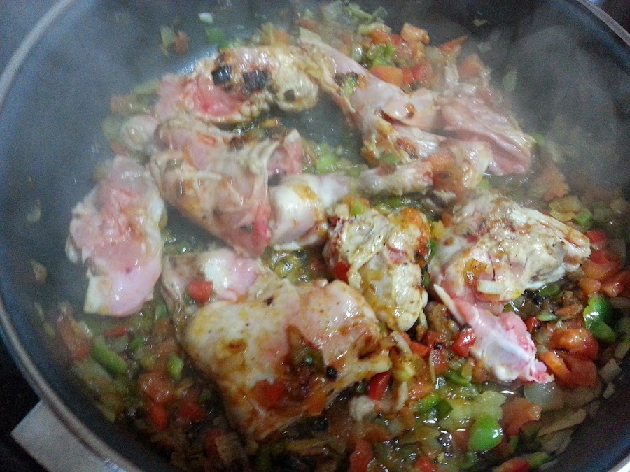 Ahora añadimos las codornices cortadas a cuartos y la pechuga de pollo troceada.