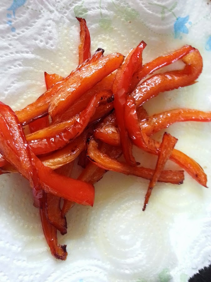 Mientras cortamos el otro medio pimiento rojo en tiras y lo freímos.