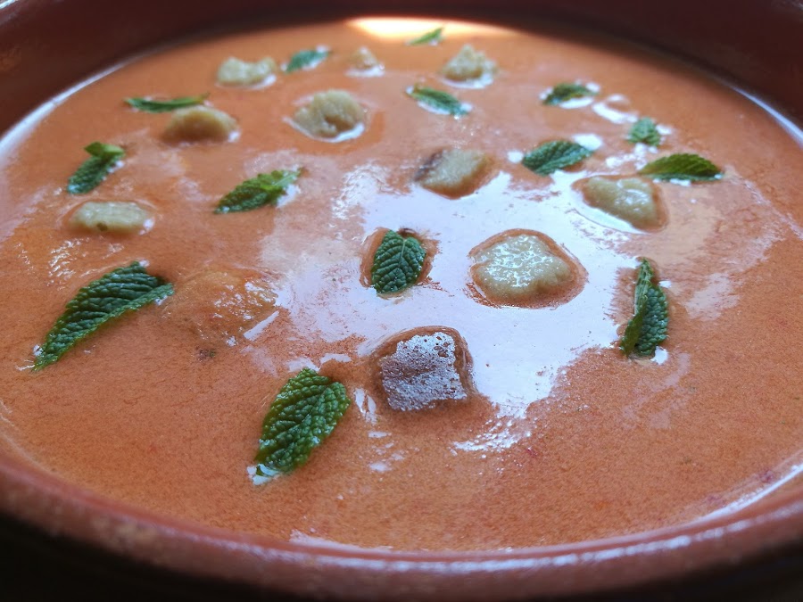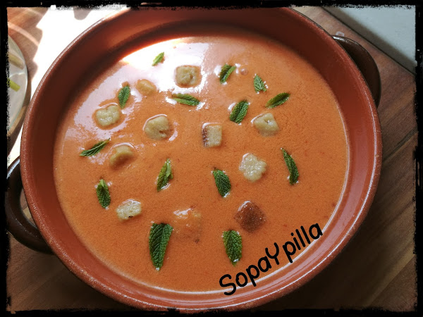 - Triturar todo (menos las hojas de menta y los picatostes) hasta que quede una sopa fina, bebible. Rectificar de sal y servir fresquito. /// En TH 1m y 1/2 V. 5-7-10 (poned un trapo encima, que no salte el cubilete)