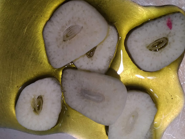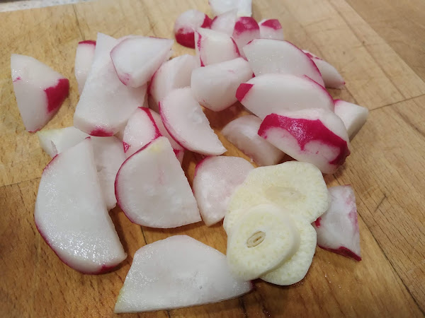 Pelar los ajos y cortarlos en rodajas. Lavar bien los rabanitos, pelarlos dejándoles un poco de su piel y cortarlos en trozos pequeños.