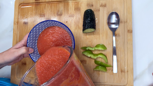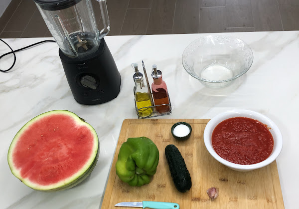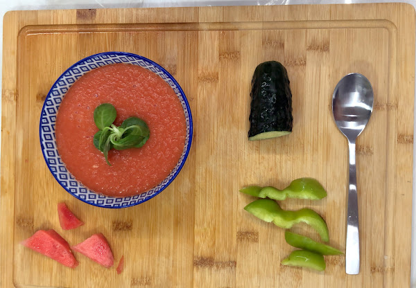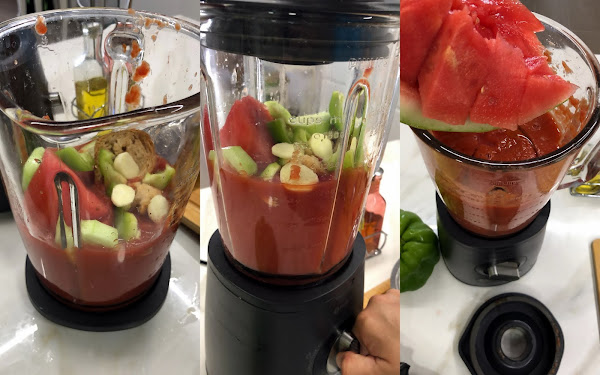 Pues eso me ha pasado hoy, mi amigo Jesús Sánchez de Cocinabueno.com, se ha ofrecido para preparar este gazpacho que es una maravilla, plato insignia de Andalucía, de España y, sobre todo, de los meses de más calor —que, por suerte para los que vivimos en la zona sur de la Península, no son pocos. Hablamos del gazpacho andaluz. Fresquito y rico. Y, en esta ocasión, de un mejunje para quienes gusten de texturas y sabores más suaves. ¿La clave? Cambiar el papel de la sandía en el menú: del postre al entrante.