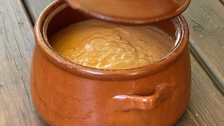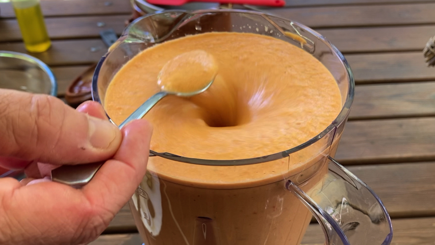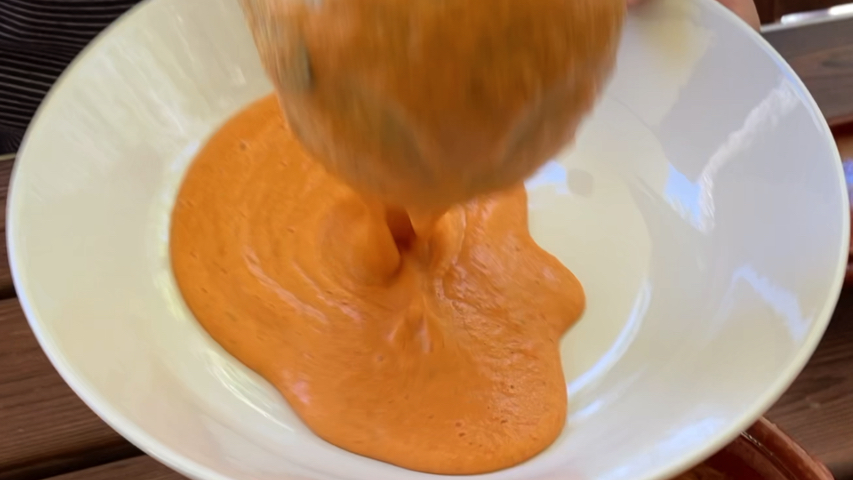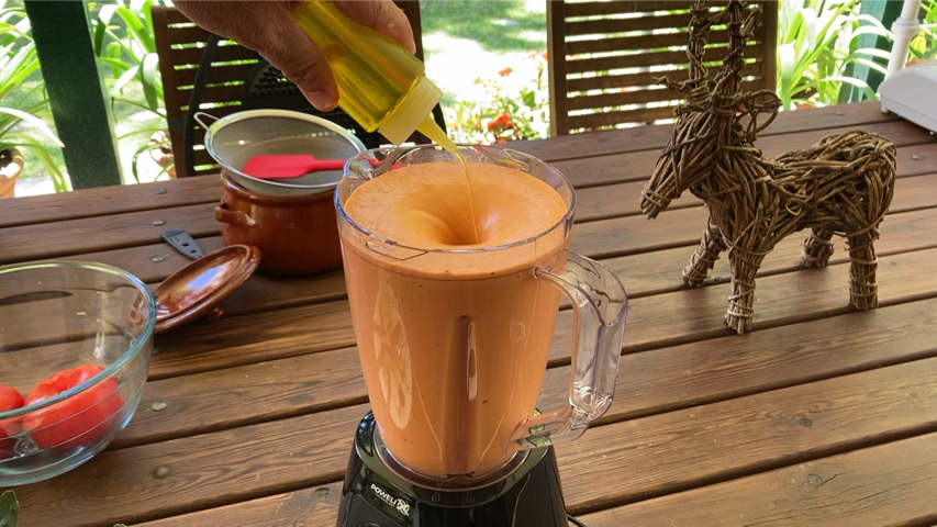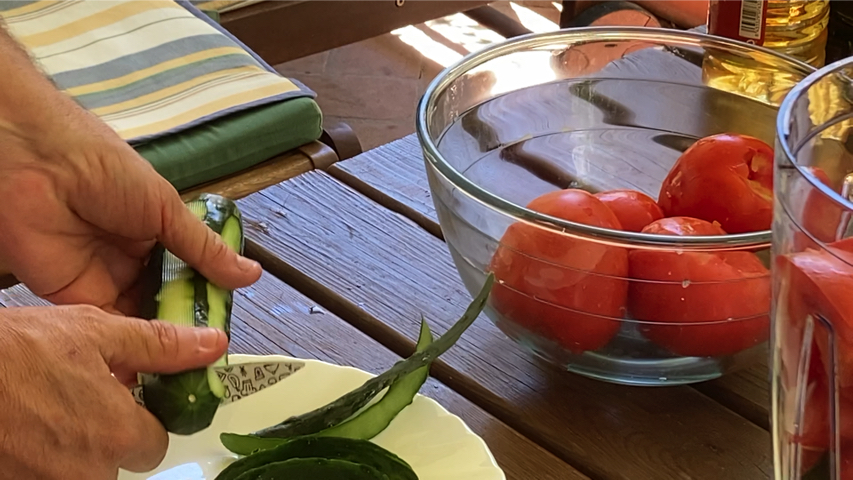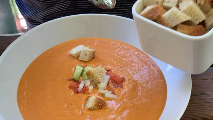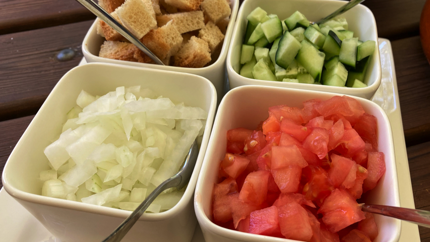 Sirve. Yo lo sirvo en plato sopero acompañado de guarnición que preparo con algunas de las verduras con las que lo he preparado (tomate, pepino, cebolla, pimiento verde) pero también se puede acompañar de huevo duro, jamón serrano, atún cocido.
