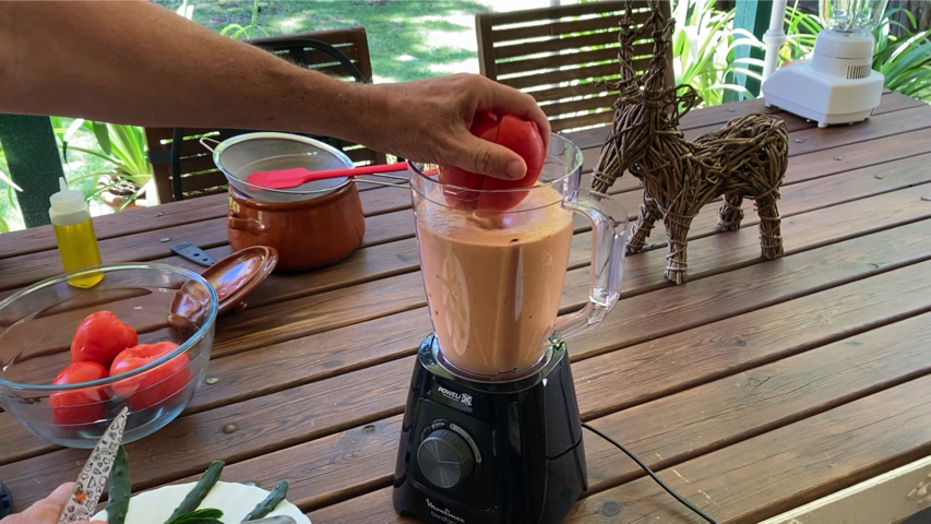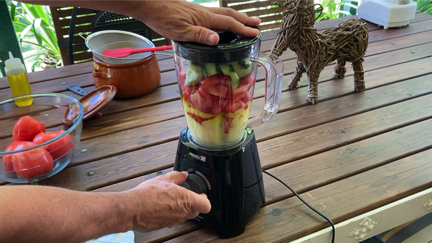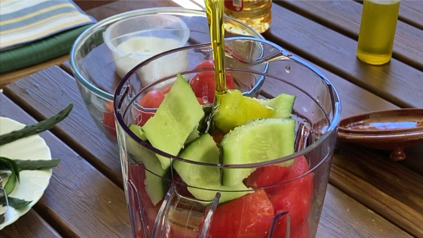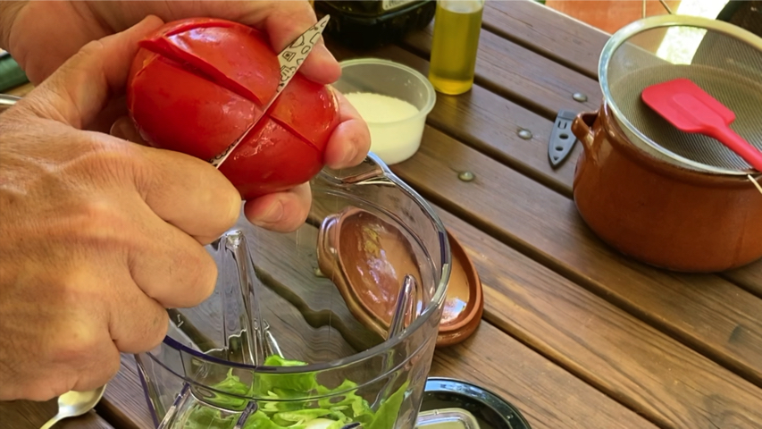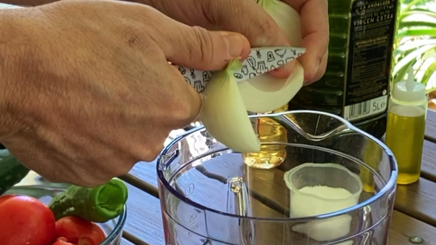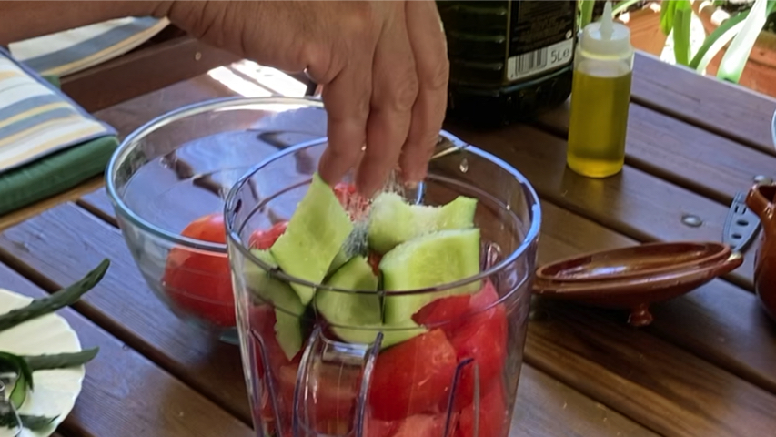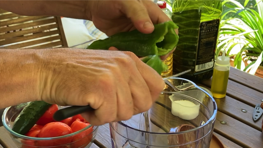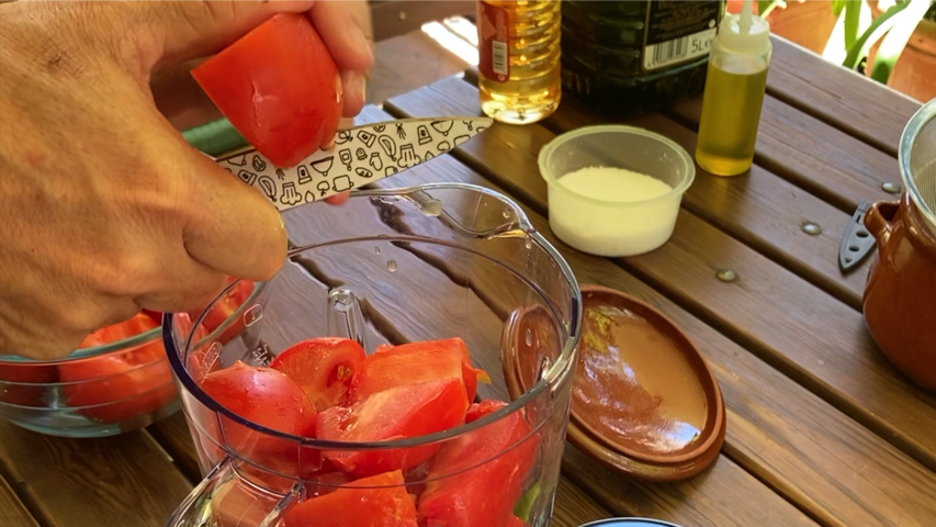 Introduce en el vaso de la trituradora el ajo, la cebolla troceada, el pimiento troceado, medio pepino troceado y todos los tomates que quepan también troceándolos un poco.