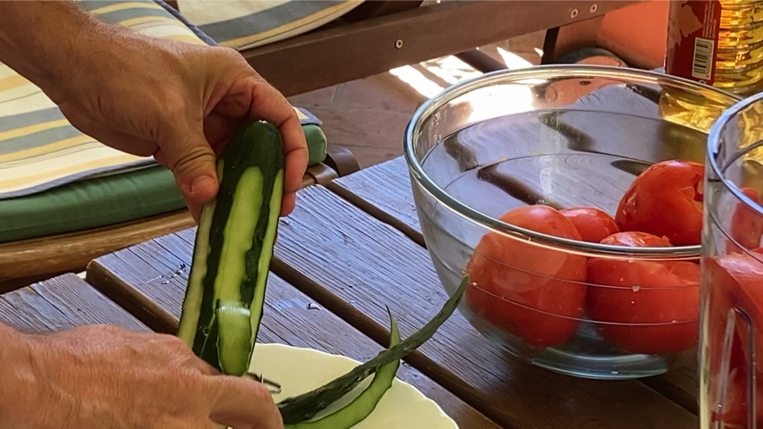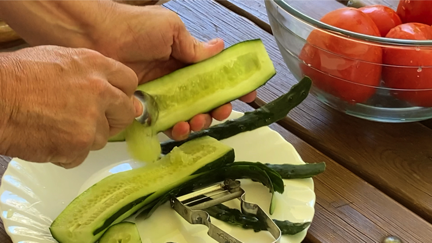 Limpia el pepino, retira los extremos, retira más o menos la mitad de la piel. Córtalos por la mitad a lo largo y retira las semillas con una cuchara de postre.
