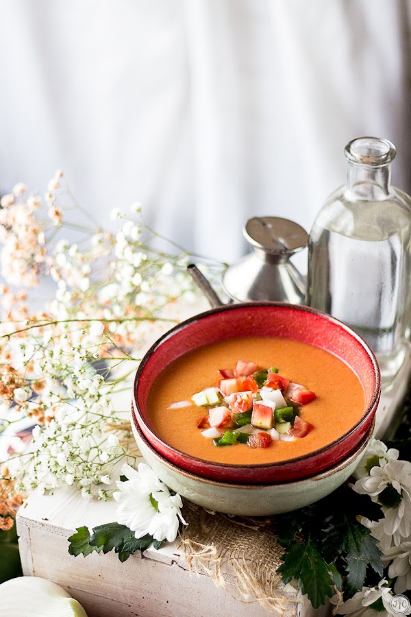 El gazpacho ha sido siempre un plato andaluz, de las zonas de interior donde el aceite es de gran calidad, al igual que los productos de la huerta. Pero, últimamente se ha extendido por toda la geografía española. Yo reconozco que en el norte no lo tomábamos cuando yo era pequeño y ahora se ha empezado a popularizar. Pero mi mayor sorpresa fue comprobar que había saltado fronteras y me encontré restaurantes en París y Viena que lo servían como parte de su carta. Es una receta fácil, sencilla, barata y refrescante para los días de verano... ¿Qué más se puede pedir?