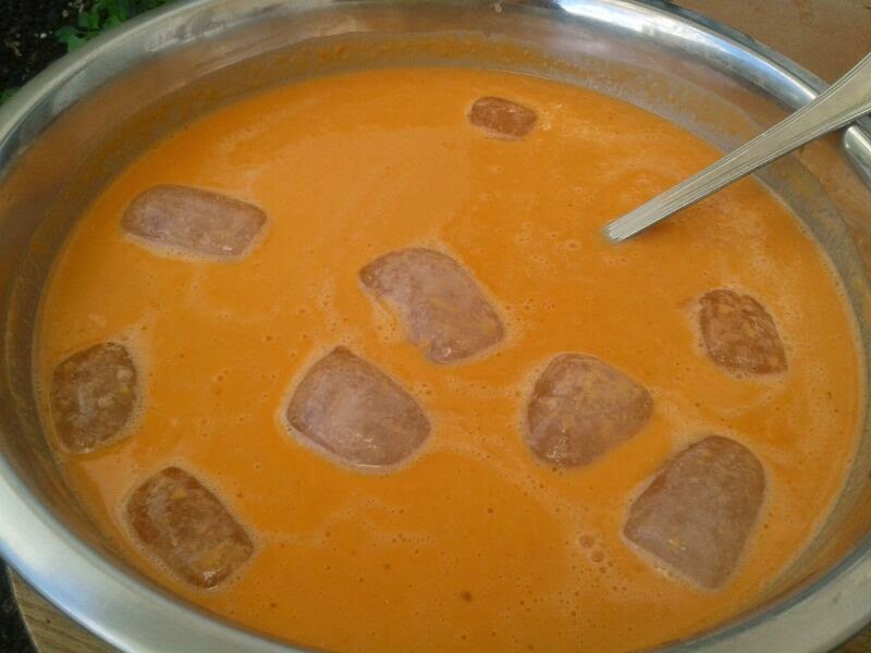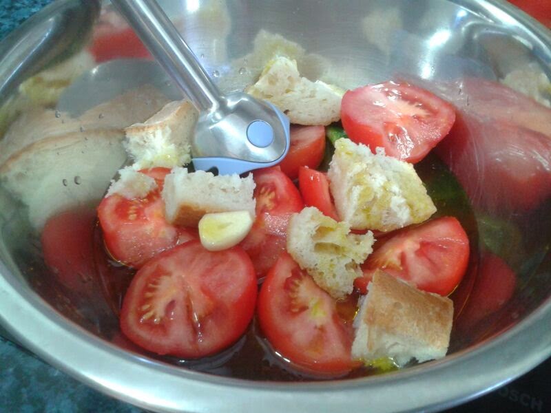 Ponemos en un recipiente los tomates y limpios y cortados, medio pimiento verde, un diente de ajo y el pan cateto "asentao". Agregamos un poco de sal, vinagre y aceite de oliva. Empezamos a trabajarlo con la batidora añadiendo un poco de agua. No suelo añadir mucha agua ya que una vez terminado le agrego unos cubitos de hielo para que se ponga bien fresquito mientras preparo el picadillo.