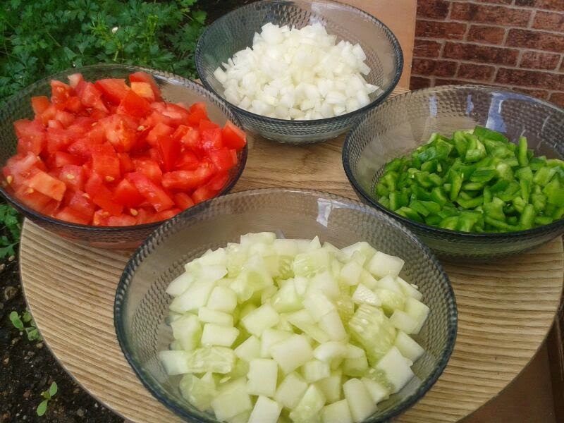 Aunque hay quien le gusta poner en el gazpacho cebolla o pepino yo no lo hago porque pienso que los ingredientes básicos son tomate, pimiento verde, ajo y pan. Dejaremos el resto de las hortalizas para preparar un picadillo con el que acompañar a nuestro gazpacho.