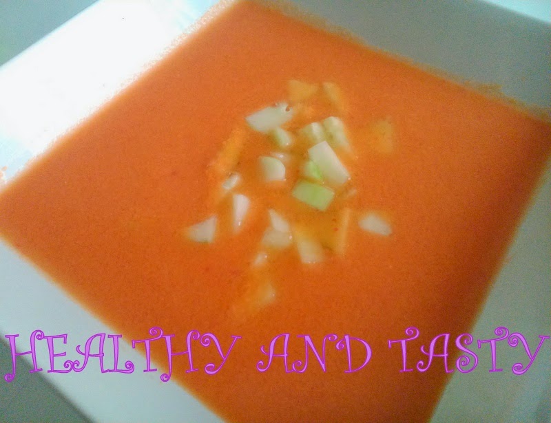 En el vaso de la batidora se echa: el ajo picado, el tomate pelado y picado, el pimiento picado, el pepino pelado y picado, un trocito pequeño de pan (opcional), un chorrito de vinagre, otro de aceite y sal. Se tritura todo junto. Se rectifica de sal y vinagre. Lo pasamos por el chino para quitar los trocitos de piel del pimiento y las pepitas del tomate. Agregamos agua fría hasta que tenga la textura que queramos.