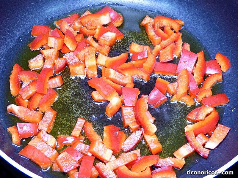 Pon a calentar el aceite en una sartén, sofríe el pimiento troceado y reserva.